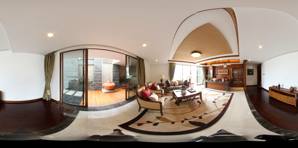 这张图片没有补地,可以看到最下面三脚架的部分。图片宽度是高度的2被,因为宽度对应的是水平方向的360度,高度对应的是垂直方向的180度。这种全景图就是球形全景图,是我们最常见的全景图类型。通常一个标准的球形全景图时包含360°×180°的范围。也就是水平360度,垂直180度。有些人搞不懂,认为是360°×360°。这么比喻吧,我们拿着一个巨大的扇子,这是一个半圆形的扇子,上至天,下至地,扇面垂直于地面,它包含了你前方垂直的180度。也及时水平点以上90度,水平点以下90度。然后拿着这把大的扇子转一圈,360度,那就是全景了,因此是360°×180°。至于什么3D,4D,720之类,我自己是没有办法给出准确的概念。