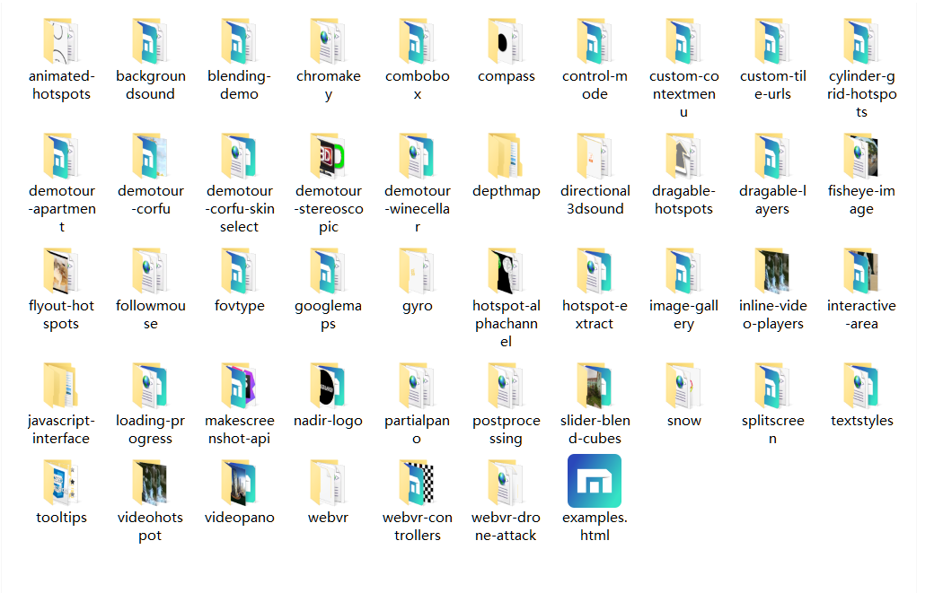 这是 krpano 的案例文件夹(1.20,1.19的examples文件夹在 viewer 文件夹下),里面包含了官方的绝大部分案例,这些案例都是学习 krpano 代码的很好的素材。我们以后将要学习到的移花接木几乎都来自于这个文件夹的案例。注意下载包的案例所使用的 viewer 是下载包自身的默认 viewer 文件夹。因为你不能简单复制案例文件夹,你还需要设置一下对应 viewer 的路径,而且该 viewer 还必须是你自己的 viewer 。