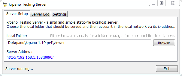 krpano Testing Server 是一个轻便简单易用的静态文件本地主机服务器。我们可以跳过本地文件安全限制且无需上传就能测试 Flash 和 HTML5 效果。其它本地网络的计算机和设备也可以浏览文件。另外它也可以控制浏览器缓存,限制下载速度来模拟更慢的网络条件。